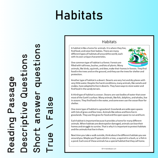 Habitats | Reading Comprehension Passage Printable Worksheet