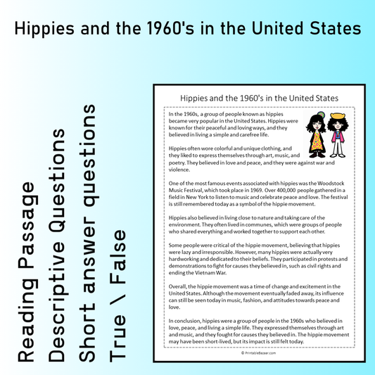 Hippies and the 1960's in the United States | Reading Comprehension Passage Printable Worksheet