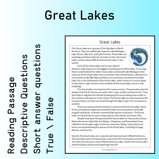 Great Lakes | Reading Comprehension Passage Printable Worksheet