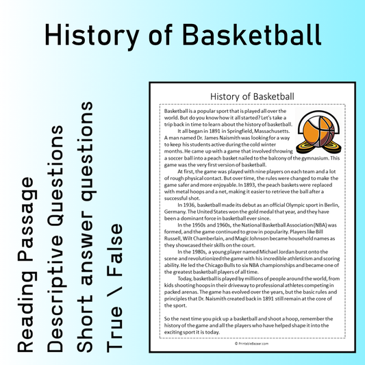 History of Basketball | Reading Comprehension Passage Printable Worksheet