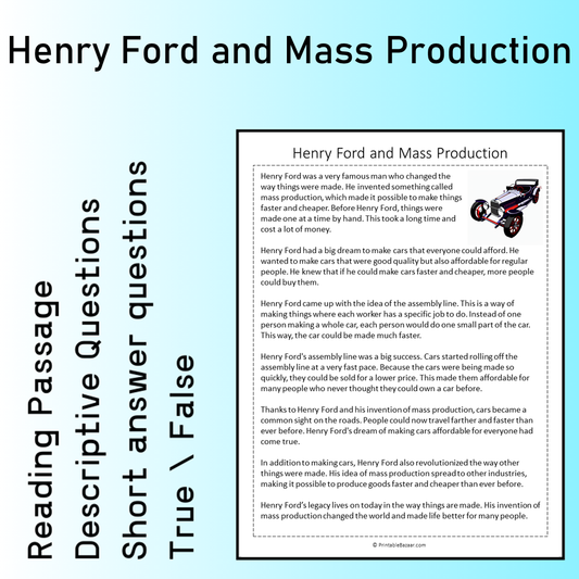 Henry Ford and Mass Production | Reading Comprehension Passage Printable Worksheet