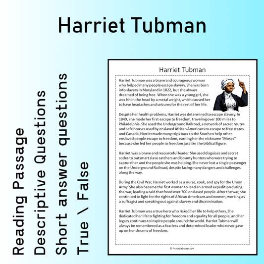 Harriet Tubman | Reading Comprehension Passage Printable Worksheet