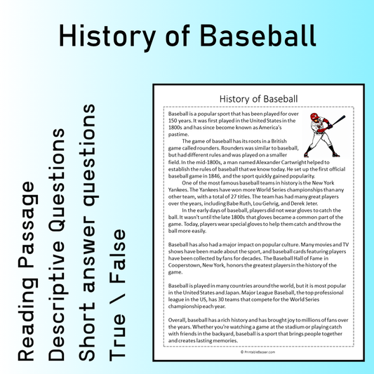 History of Baseball | Reading Comprehension Passage Printable Worksheet