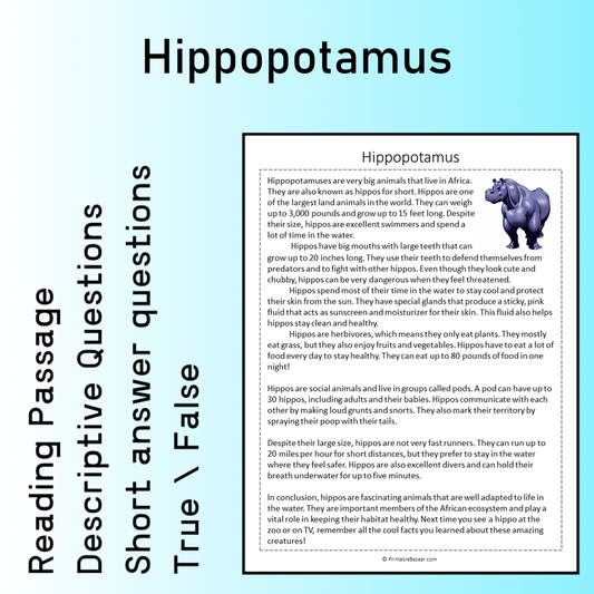 Hippopotamus | Reading Comprehension Passage Printable Worksheet