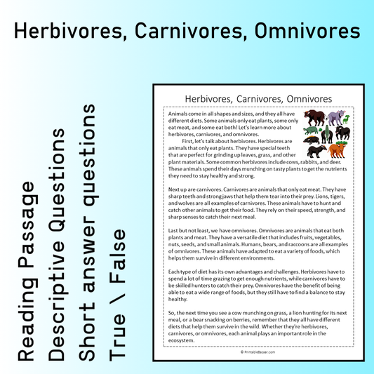 Herbivores, Carnivores, Omnivores | Reading Comprehension Passage Printable Worksheet