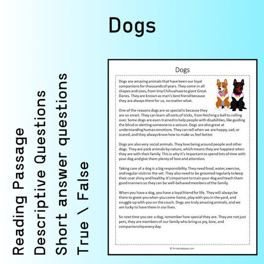 Dogs | Reading Comprehension Passage Printable Worksheet