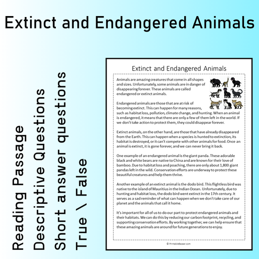 Extinct and Endangered Animals | Reading Comprehension Passage Printable Worksheet