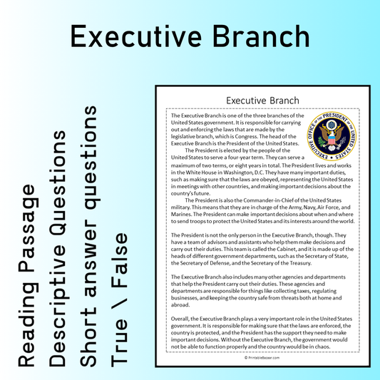 Executive Branch | Reading Comprehension Passage Printable Worksheet