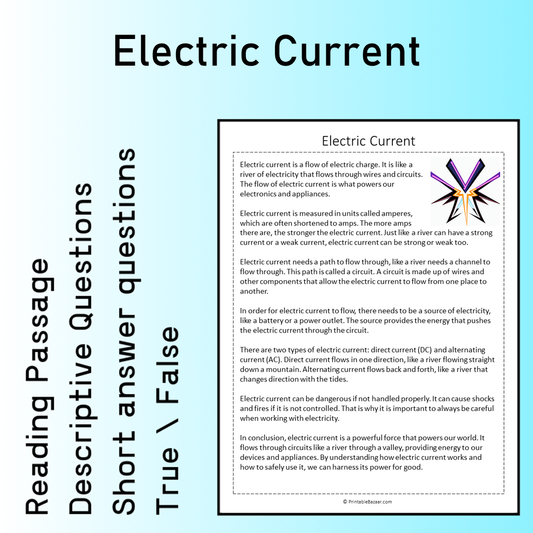 Electric Current | Reading Comprehension Passage Printable Worksheet