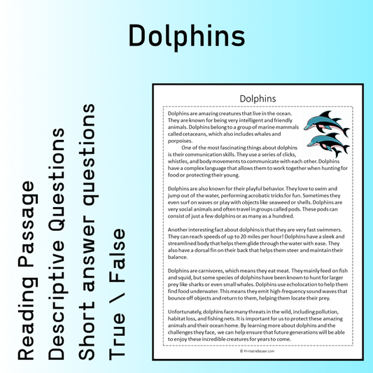 Dolphins | Reading Comprehension Passage Printable Worksheet