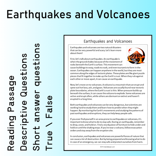 Earthquakes and Volcanoes | Reading Comprehension Passage Printable Worksheet