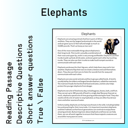 Elephants | Reading Comprehension Passage Printable Worksheet