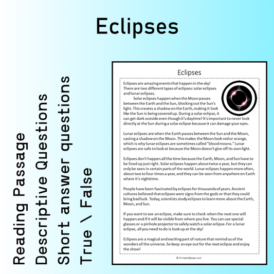 Eclipses | Reading Comprehension Passage Printable Worksheet