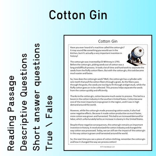 Cotton Gin | Reading Comprehension Passage Printable Worksheet