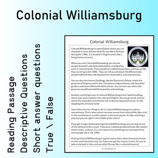 Colonial Williamsburg | Reading Comprehension Passage Printable Worksheet