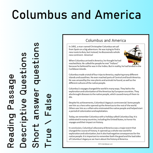 Columbus and America | Reading Comprehension Passage Printable Worksheet