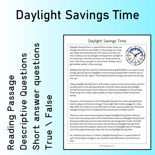 Daylight Savings Time | Reading Comprehension Passage Printable Worksheet