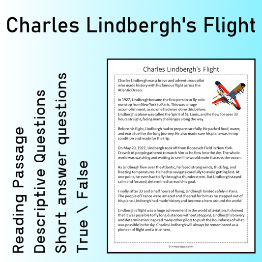 Charles Lindbergh's Flight | Reading Comprehension Passage Printable Worksheet