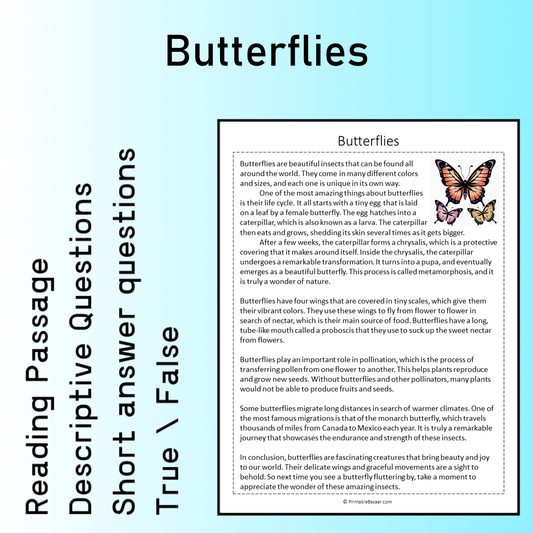 Butterflies | Reading Comprehension Passage Printable Worksheet