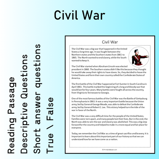 Civil War | Reading Comprehension Passage Printable Worksheet