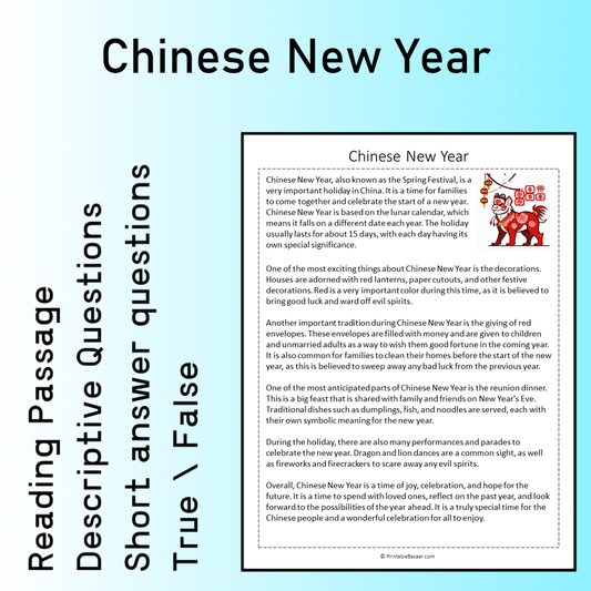 Chinese New Year | Reading Comprehension Passage Printable Worksheet