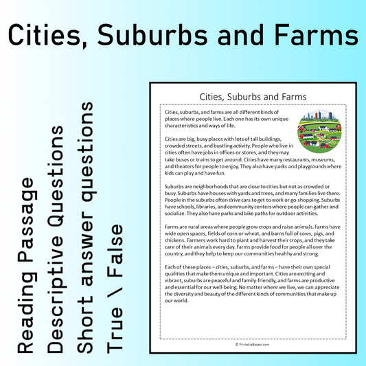 Cities, Suburbs and Farms | Reading Comprehension Passage Printable Worksheet