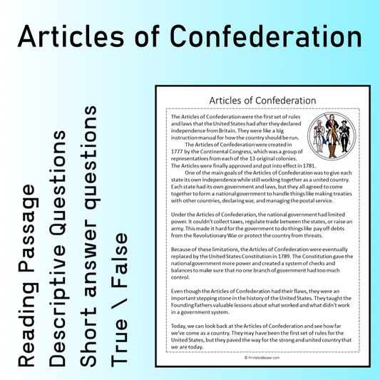 Articles of Confederation | Reading Comprehension Passage Printable Worksheet