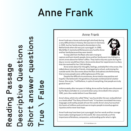 Anne Frank | Reading Comprehension Passage Printable Worksheet