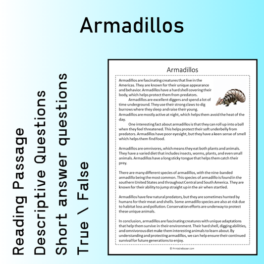 Armadillos | Reading Comprehension Passage Printable Worksheet