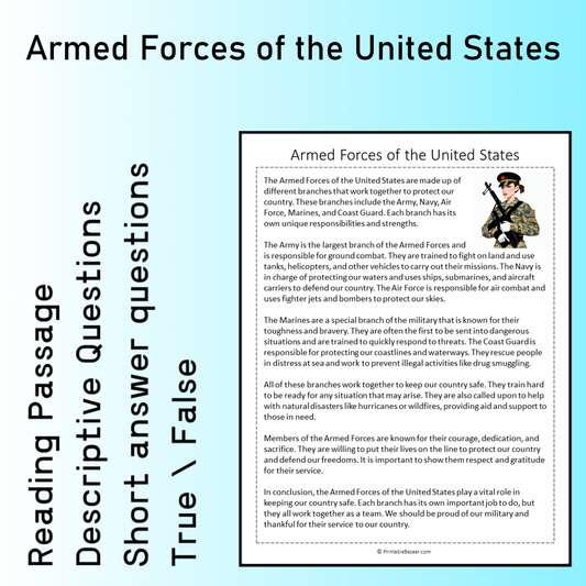 Armed Forces of the United States | Reading Comprehension Passage Printable Worksheet