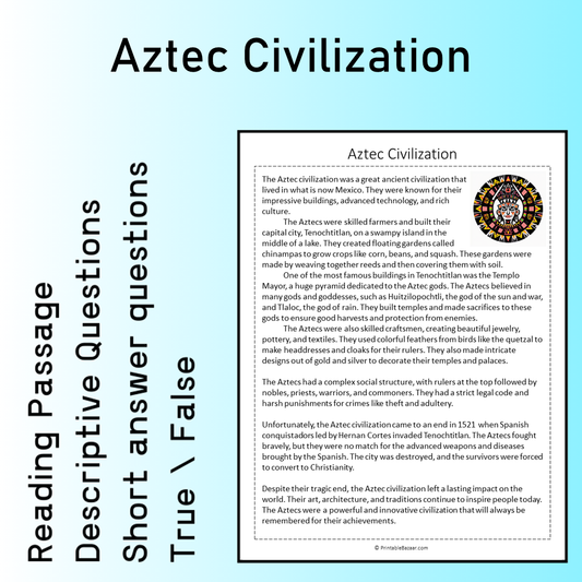 Aztec Civilization | Reading Comprehension Passage Printable Worksheet