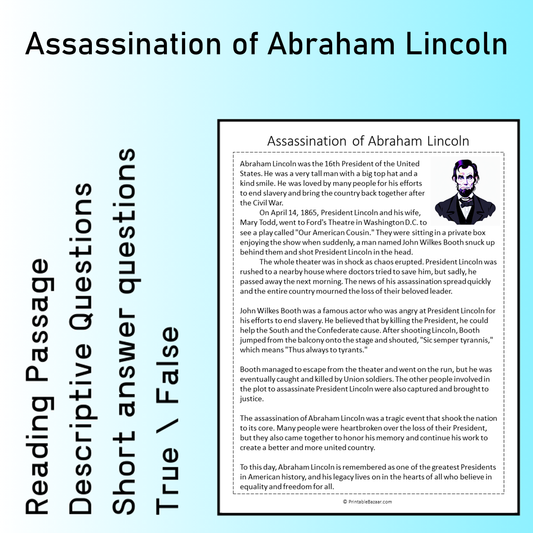 Assassination of Abraham Lincoln | Reading Comprehension Passage Printable Worksheet