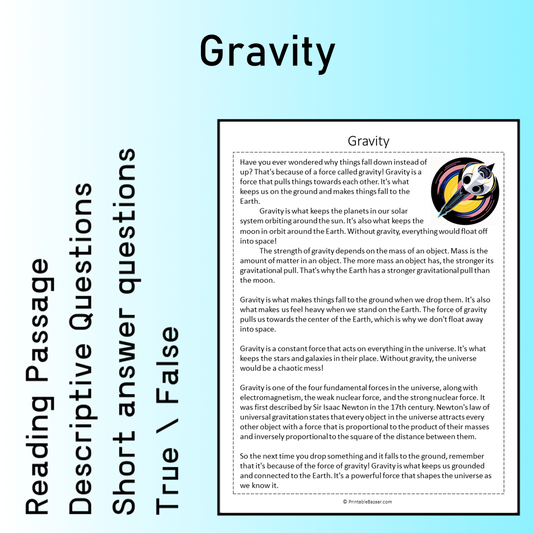Gravity | Reading Comprehension Passage Printable Worksheet