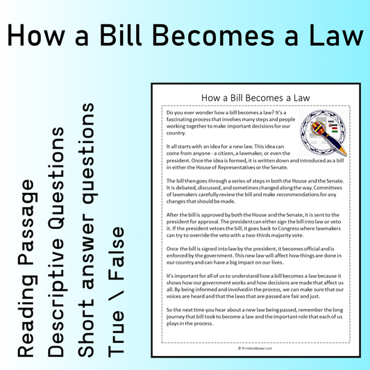 How a Bill Becomes a Law | Reading Comprehension Passage Printable Worksheet