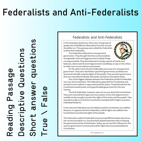 Federalists and Anti-Federalists | Reading Comprehension Passage Printable Worksheet