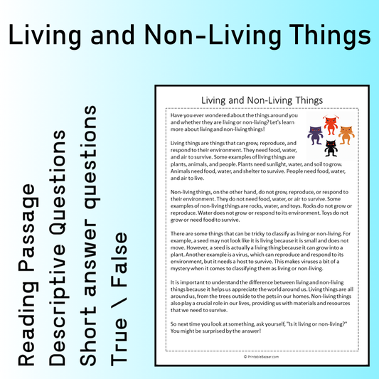 Living and Non-Living Things | Reading Comprehension Passage Printable Worksheet