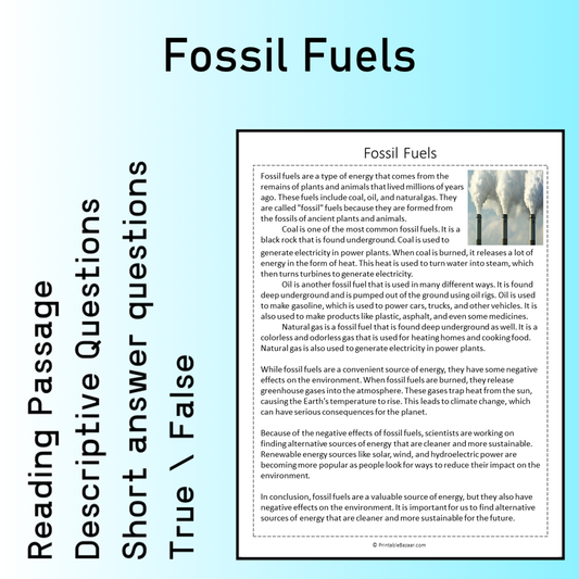 Fossil Fuels | Reading Comprehension Passage Printable Worksheet