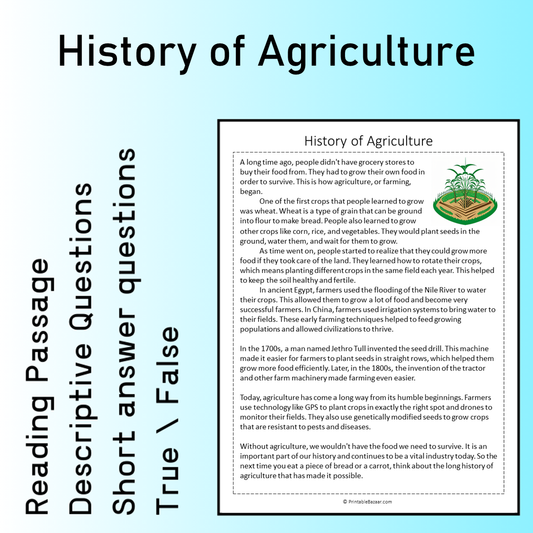 History of Agriculture | Reading Comprehension Passage Printable Worksheet