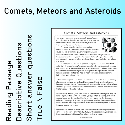 Comets, Meteors and Asteroids | Reading Comprehension Passage Printable Worksheet