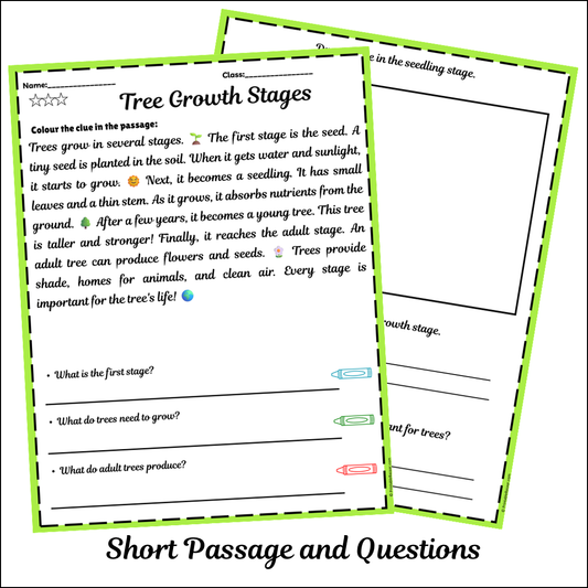 Tree Growth Stages | Short Reading Comprehension Creative Worksheet