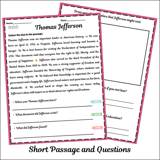 Thomas Jefferson | Short Reading Comprehension Creative Worksheet