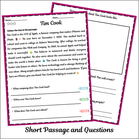 Tim Cook | Short Reading Comprehension Creative Worksheet