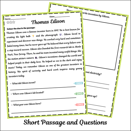 Thomas Edison | Short Reading Comprehension Creative Worksheet