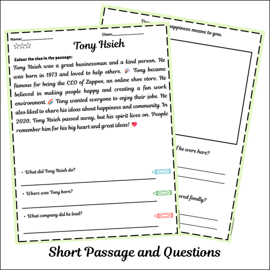 Tony Hsieh | Short Reading Comprehension Creative Worksheet
