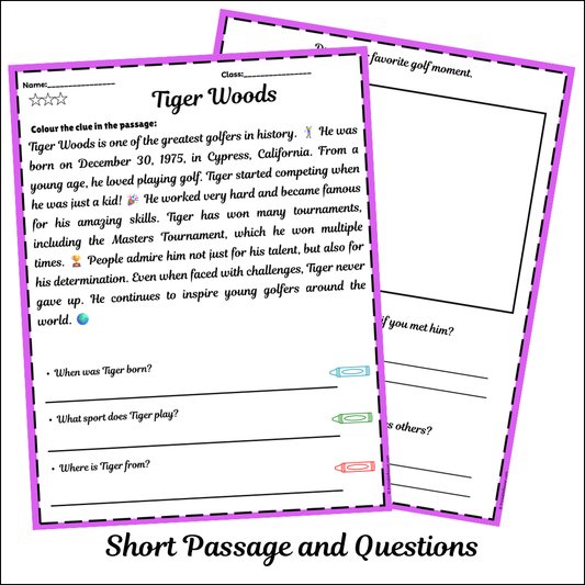 Tiger Woods | Short Reading Comprehension Creative Worksheet