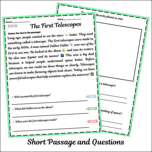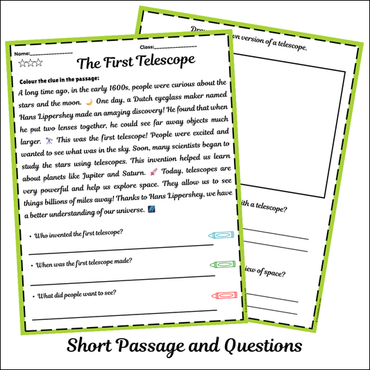 The First Telescope | Short Reading Comprehension Creative Worksheet