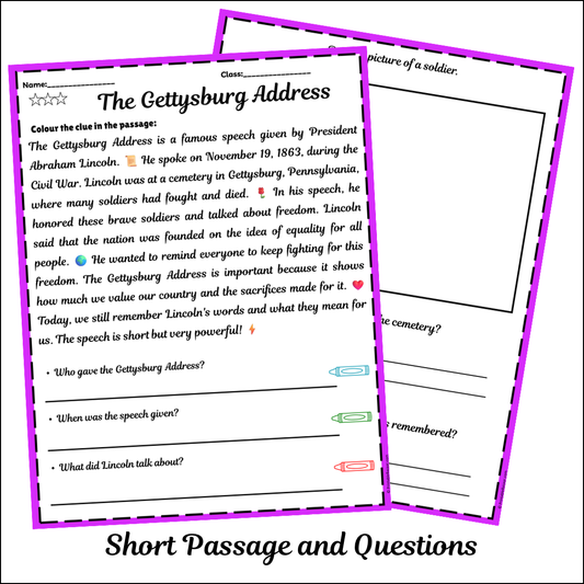 The Gettysburg Address | Short Reading Comprehension Creative Worksheet