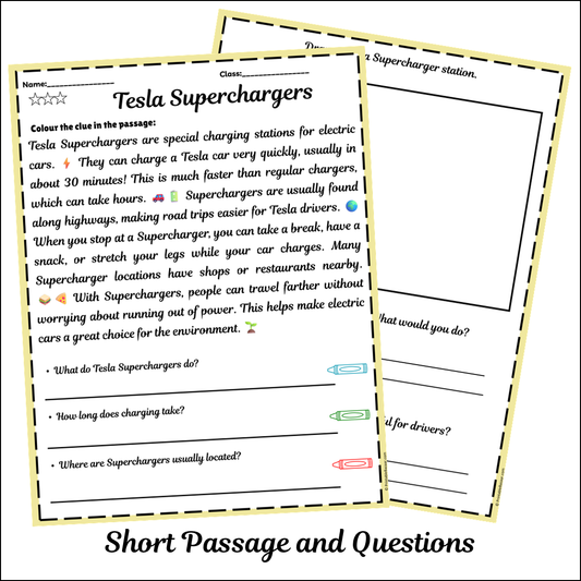 Tesla Superchargers | Short Reading Comprehension Creative Worksheet