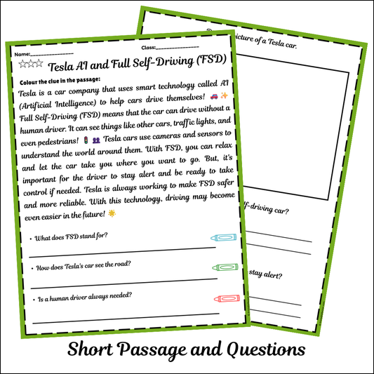 Tesla AI and Full Self-Driving (FSD) | Short Reading Comprehension Creative Worksheet