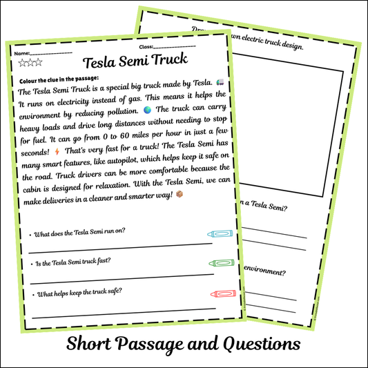 Tesla Semi Truck | Short Reading Comprehension Creative Worksheet